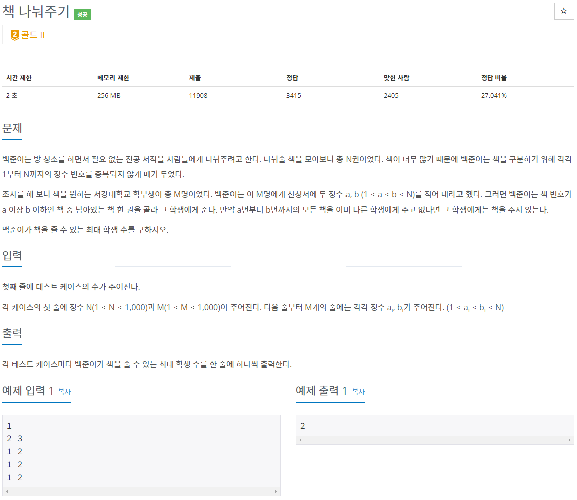 1번부터 N번까지의 책을 가지고 있고, a부터 b까지 중 하나의 책을 최대한 많은 학생에게 나눠주면 된다.